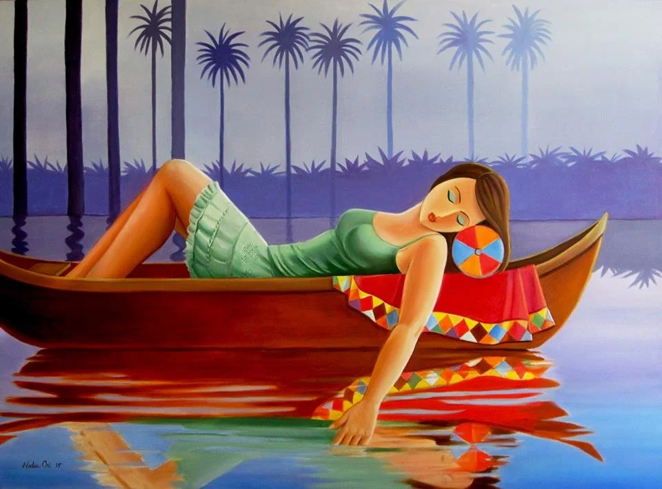 1. The woman in the boat is a reference from the well-known Iraqi female artist Nadia Osi’s painting of a woman enjoying her time in the rivers of Iraq. She rests her head on a colorful pillow, drifting along the waters: