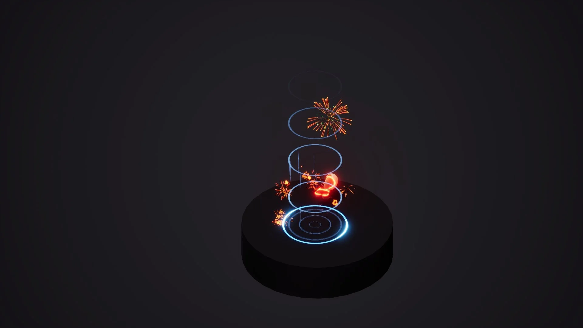 This firework distinguishing feature is that it has two colors (red and green here). Once the red flower has cooled down, the green points have a second, chain explosion. Since this one is the biggest and more showy firework, I left it for the end of the animation as the ‘finale’.