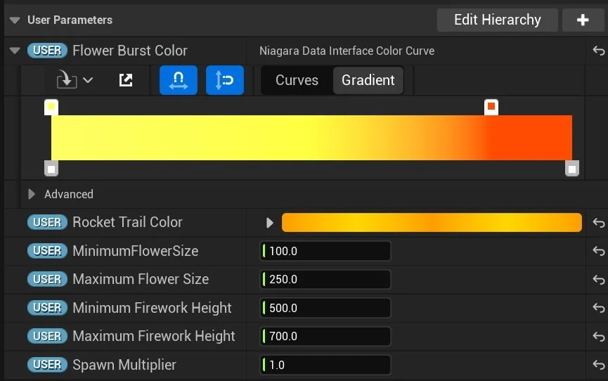 All of the fireworks have a blueprint assigned to them called ‘Easy Scale’. This blueprint makes it easy for me/the user to rescale the effect in local scale without breaking the overall Niagara effect because it keeps the ratio between the ribbon width and sprite size fixed: