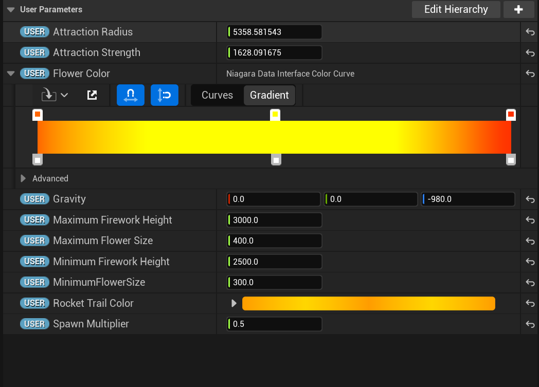 This module attaches particles to a skeletal mesh’s surface then randomly distributes particles across the mesh using world-space triangle data. It also allows for offsetting and scaling adjustments as user parameters. The particle points that the Scratch Pad module generates determines the firework flower’s location.